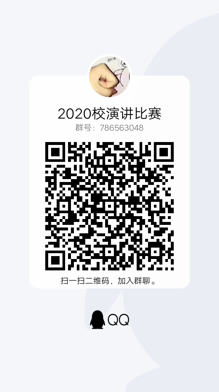 群号:786563048,群名:2020校演讲比赛,随时关注群内比赛通知,群二维码: