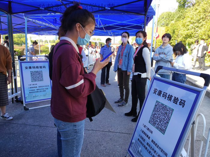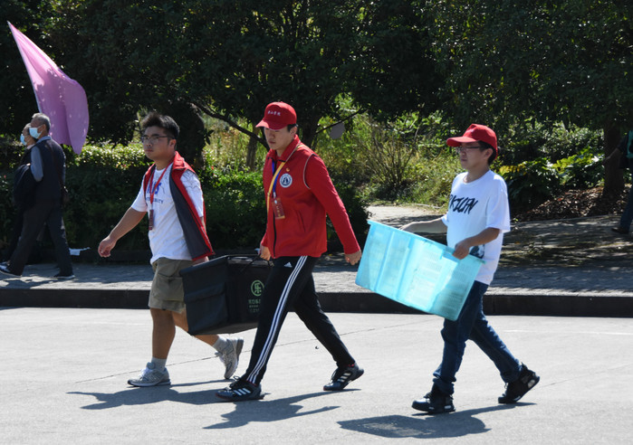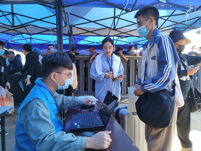 迎新现场,气氛热烈,新生们在志愿者和工作人员的帮助引导下依次经过体温检测、身份证核验、安康码核验等环节后方可进入校园,审核通过后有序走进校园,乘坐摆渡车前往宿舍区办理报到手续。