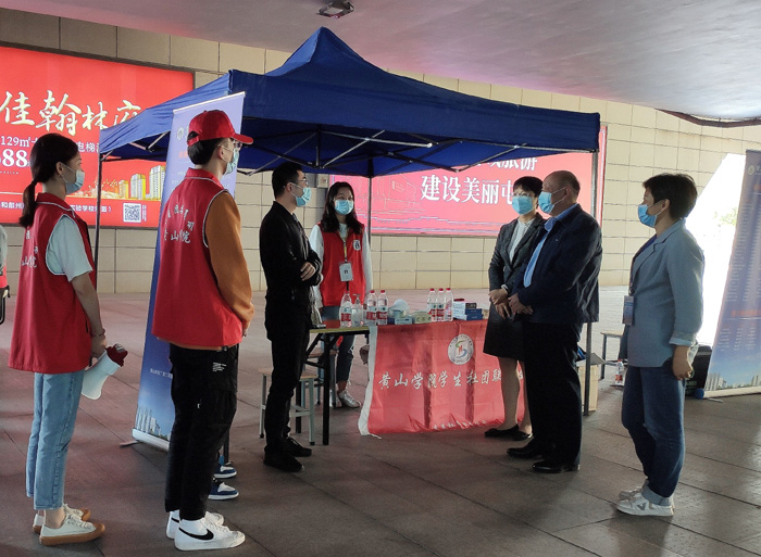 上午,校领导李铁范、胡家俊、胡善风、张德学、陈家祥在办公室、组织部、宣传部、教务处、学生处、保卫处、后勤服务集团等部门负责人的陪同下检查指导迎新工作。他们先后来到率水校区大门口、新生报到点、宿舍区、保卫处及高铁站等地,亲切看望2020级新生,检查指导各个环节的迎新工作,慰问迎新工作人员和志愿者。