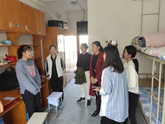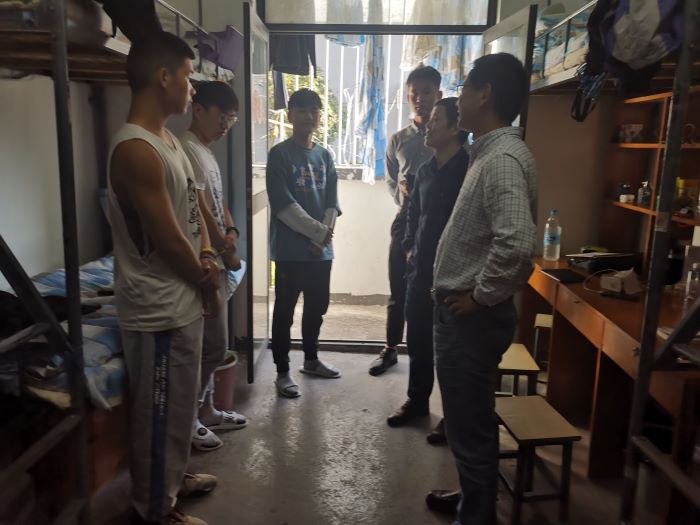 10日下午,该院党政领导及新生辅导员走访各专业的新生宿舍。“你们来自哪里?”“通过什么方式来的学校?”“喜欢什么样的运动?”几句简短的问候使院领导与新生迅速打成一片,他们详细询问新生到校后的住宿、就餐等方方面面的情况,并提醒同学们在平常的生活中,务必注意财物安全、用电安全、人身安全,保持宿舍卫生、加强内务整理。
