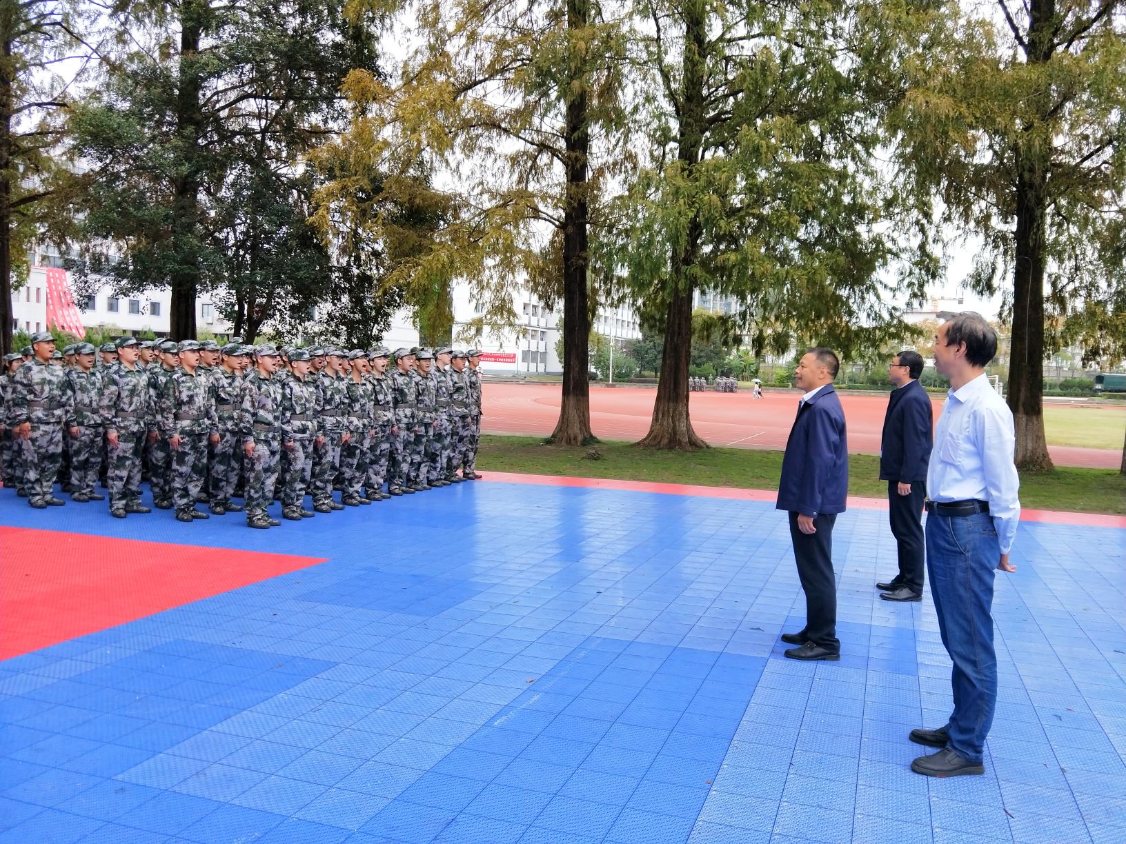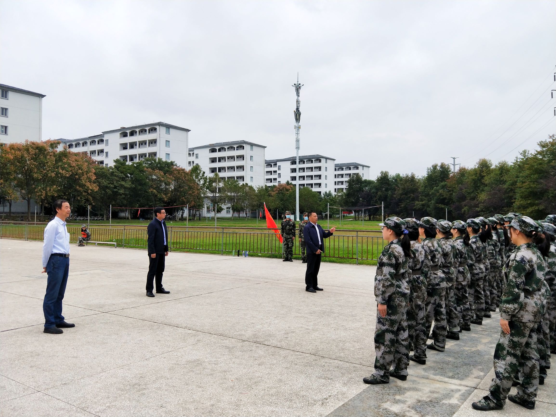 10月15日上午10点,建筑工程学院党委书记范兴华、院长周甄川、党委副书记黄世平一行来到率水校区和横江校区的军训队列之中看望并慰问新生。