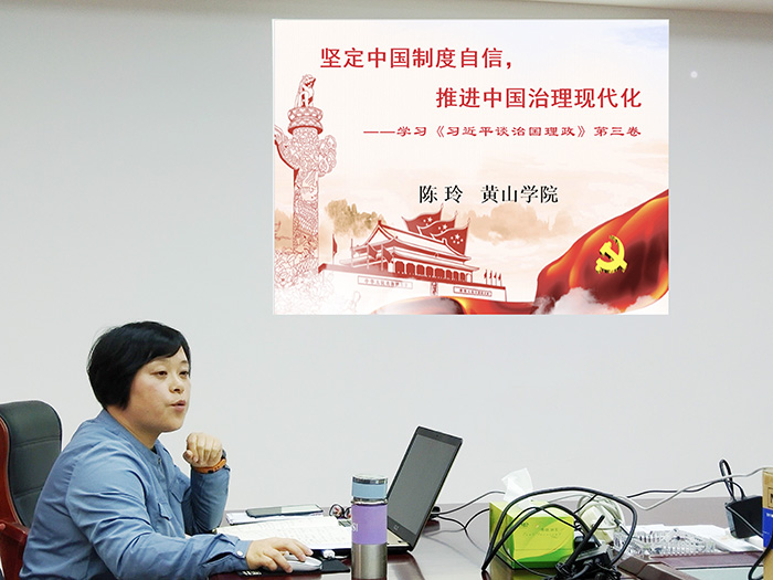 10月21日下午,文化与传播学院党委在会议室举办了主题为《坚定中国制度自信,推进中国治理现代化》的《习近平谈治国理政》第三卷的学习宣讲报告会,全院教职工参加宣讲会。宣讲会由院党委书记汪家庚主持,马克思主义学院副教授陈玲博士主讲。