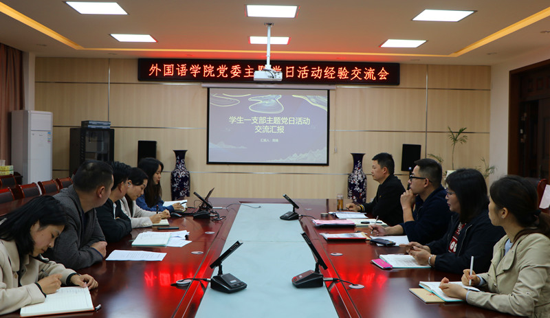 10月28日下午,外国语学院党委在逸夫综合楼5402会议室召开主题党日经验交流会。该院党委委员、支部书记参加会议。会议由该院党委书记、院长黄先进主持。