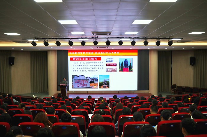 11月9日晚上,校团委在文端楼二楼报告厅举办“青年心,中国梦”百场报告会,马克思主义学院吴云峰教授应邀作主题为“弘扬新四军铁军精神,担当新时代历史使命”主题报告,全校近300名师生聆听此次报告会。