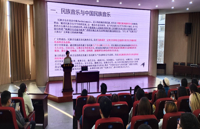 刘咏莲从民间音乐、文人音乐、宫廷音乐和宗教祭祀音乐等四个方面分别向大家讲解了中国传统音乐中民间歌曲、说唱音乐、舞蹈音乐、戏曲音乐、传统器乐的基本概念和发展历程。刘教授以音乐为切入点讲述了民族音乐的起源,传统音乐与民族音乐两者的紧密联系,强调了民族音乐在当今社会的深刻内涵和重要意义。最后结合当下中国传统音乐发展的现状,详细阐述了传统音乐在音乐基础教育和美育中的作用,并提出了对传统音乐发展错位的反思,最后结合其多年从事传统音乐研究与教学的心得体会对未来传统音乐的保护和发展提供了几点思路。