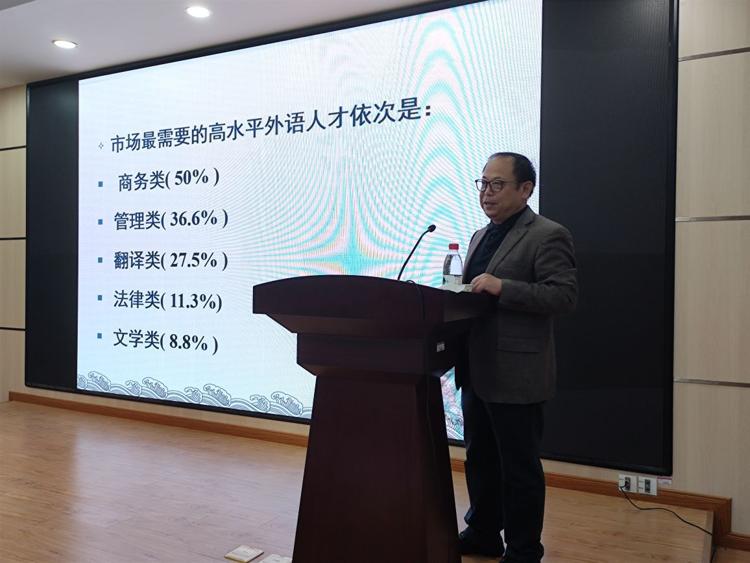 11月20日下午,外国语学院在逸夫综合楼5306教室举办求真·励学讲坛。周平教授做客讲坛,作题为《商务英语:过去、现在与未来》的主题报告。该院副院长洪常春主持讲坛,该院60余名19级英语专业学生参与讲坛。