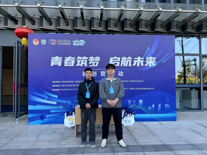 3月19日至20日,由共青团安徽省委学校部、安徽省学生联合会主办的“青春筑梦•启航未来”首期青年创新创业菁英训练营在合肥滨湖金融小镇成功举办。经校团委遴选,我校艺术学院石建飞(2022级产品设计专业)、机电工程学院金义勇(2023级材料成型及控制工程专业)两位学子代表学校参训。