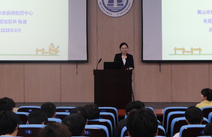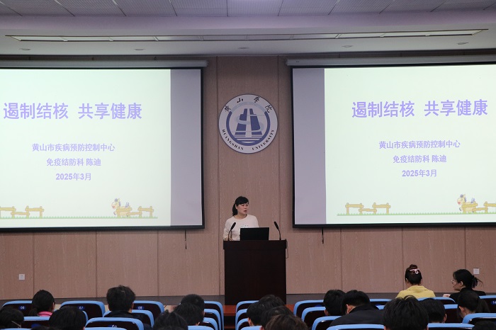 讲座特邀心理健康教育中心专职教师程思与黄山市疾控中心副主任医师陈迪联合授课。针对大学生群体特点,讲座涵盖大学生常见心理问题识别和应对、高校结核病防治两大模块。心理健康教育中心程思从心理健康与心理健康素养的现状与内涵开始,强调了早期识别心理健康疾病和及时干预的重要性,并分享了多种实用的心理健康应对策略。疾控中心陈迪通过丰富的实践经验,用通俗易懂的语言,向学生们详细讲解了结核病的危害、传播途径、易感人群、症状、诊断方法、治疗原则、以及预防措施等知识。