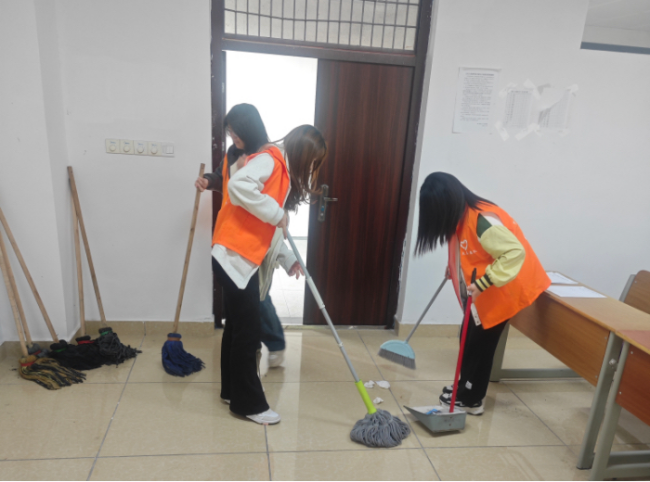 3月23日,文传院星火志愿队成员汇聚考研教室,开展卫生打扫活动。他们分组行动,两人一组清扫地面,一人负责清理桌面垃圾,配合默契,效率极高。