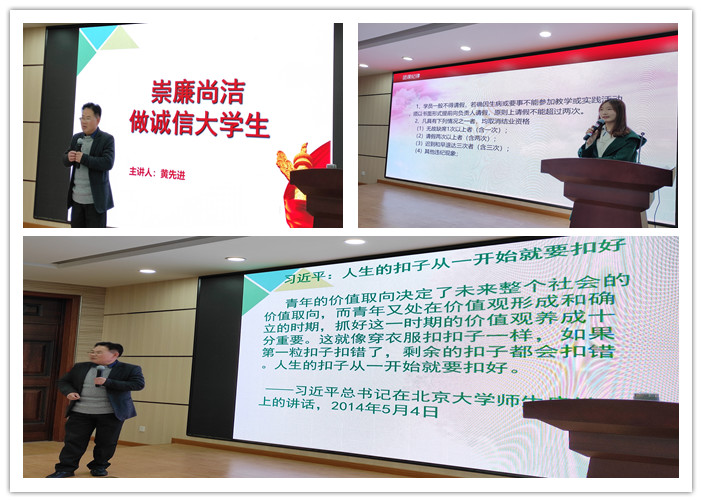 外国语学院党委书记、院长黄先进作为主讲人,作题为“崇廉尚洁、做诚信大学生”的廉洁教育讲座。黄先进讲述了党中央对于廉洁的要求:要把权力关进制度的笼子里,形成不敢腐的惩戒机制、不能腐的防范机制、不易腐的保障机制。此外,黄先进从四个“需要”强调了大学生廉洁教育的重要性:大学生廉洁教育是高校人才培养的需要、是高校廉政文化建设的需要、是构建和谐社会的需要以及是弘扬中华民族传统美德的需要。黄先进指出,考试舞弊、论文抄袭、骗取或恶意拖欠国家助学贷款、毕业生就业诚信缺失、部分学生干部行为失范和生活奢侈浪费都是大学生不廉洁修身的具体表现。他提出大学生应树立廉洁的风尚和品格,向廉洁高尚的榜样学习,并不断提高自身的思想道德修养。随后,黄先进阐述了十九大释放的八大重磅反腐信号。